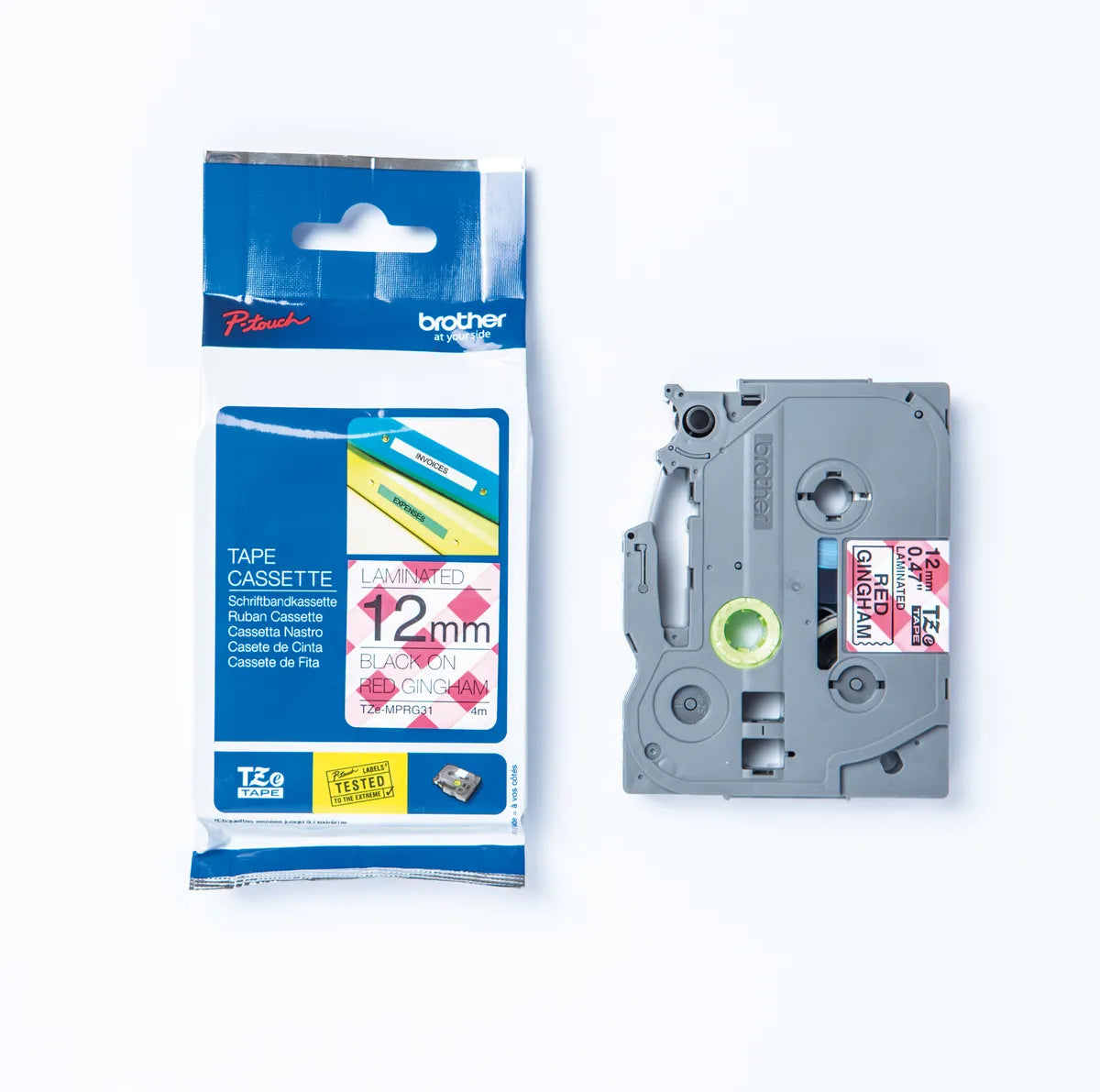 Brother TZE-MPRG31 Schriftband schwarz auf rot kariert (12mm x 4m)