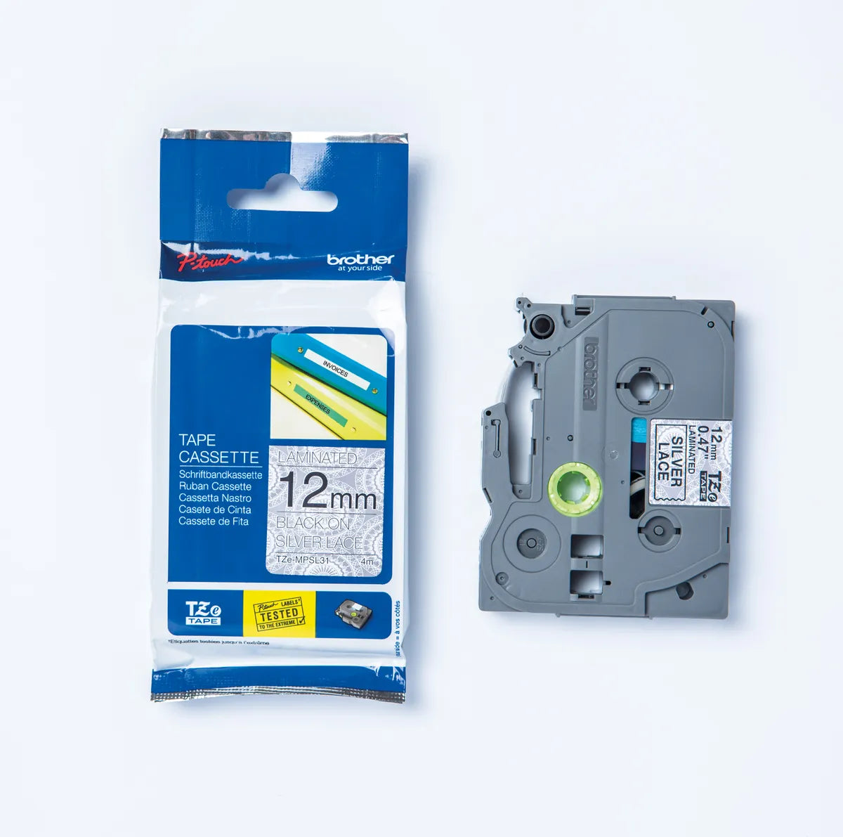 Brother TZE-MPSL31 Schriftband schwarz auf silber Spitze (12mm x 4m)