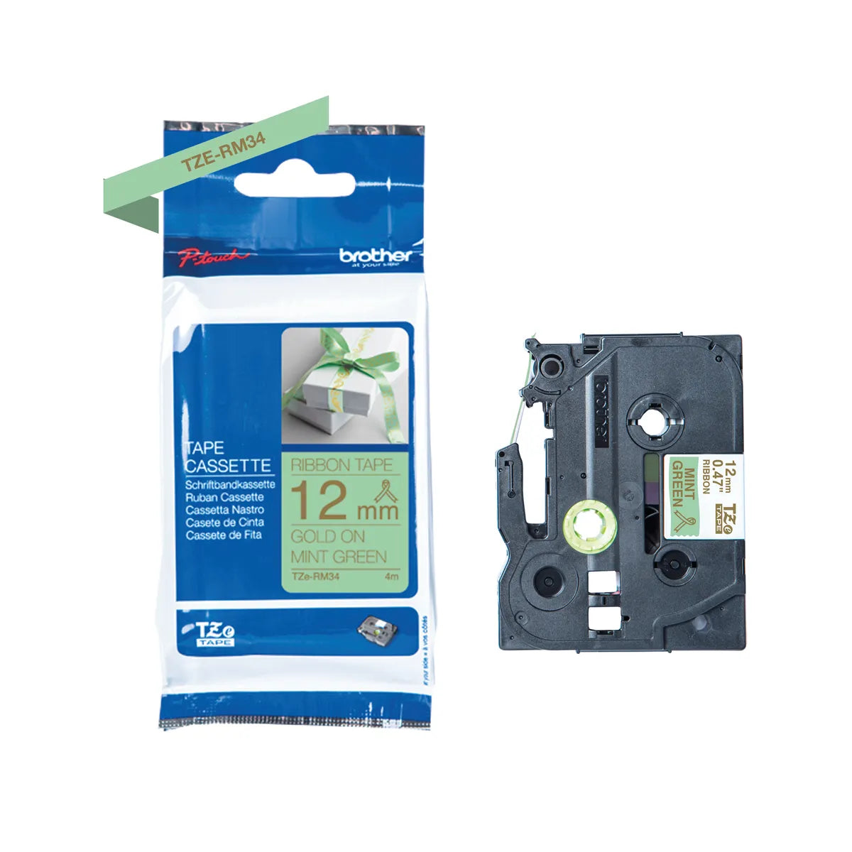 Brother TZE-RM34 Schriftband gold auf mintgrün (12mm x 4m)